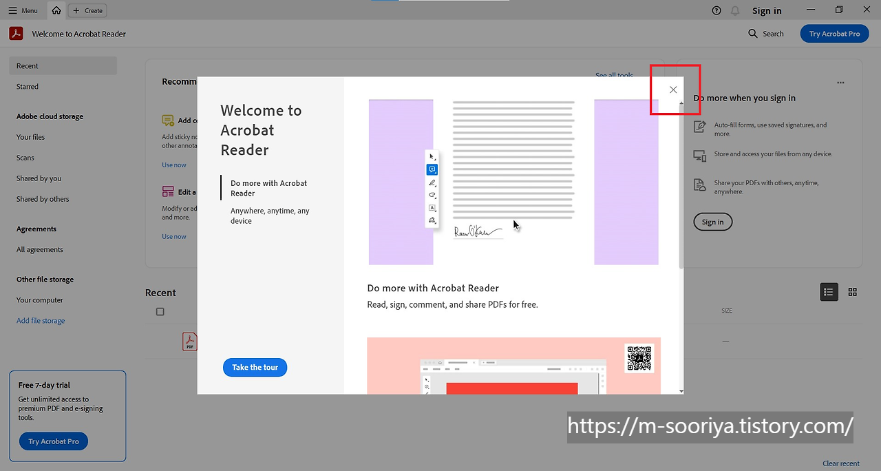 Acrobat Reader가 성공적으로 설치되고 실행되면, 웰컴 메시지를 닫고 프로그램을 사용하세요.