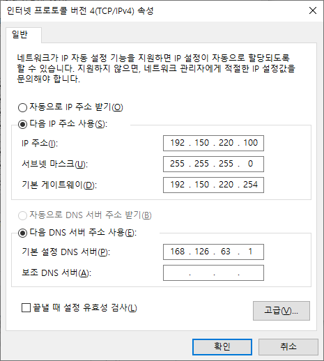 * DNS 서버주소는 통신사마다 다르며, 자동으로 해놔도 접속은 되겠지만 확인해서 고정으로 잡아주는것이 좋다