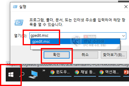 1) 키보드 윈도우 시작버튼 + R을 누른다 -> gpedit.msc 를 입력 후, 엔터