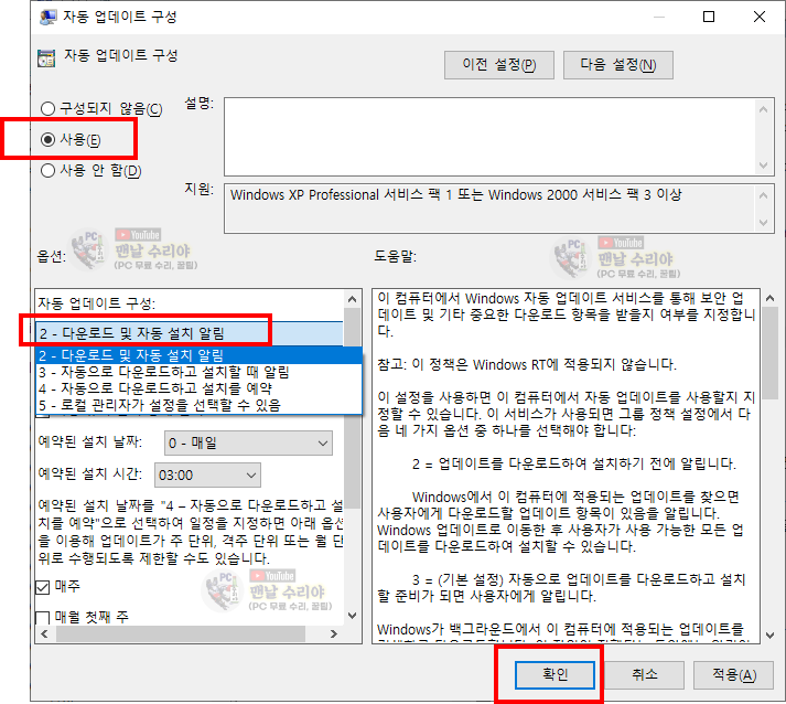 * 사용 -> 자동업데이트 구성 (2. 다운로드 및 자동 설치 알림) 선택 -> [확인]