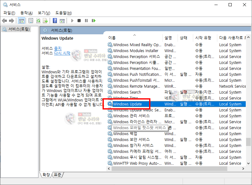 만약 윈도우 업데이트를 다시 시작하고 싶다면, 위의 설정을 역순으로 바꿔주면 된다.