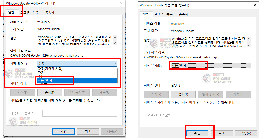 3) [일반]탭 -> [시작 유형] -> [사용 안함] 으로 설정-> [확인]