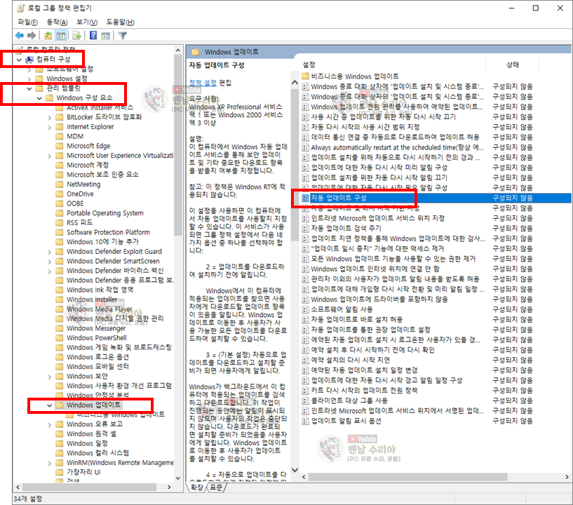 - 컴퓨터 구성 -> 관리 템플릿 -> Windows 구성 요소 -> Windows 업데이트 -> 자동 업데이트 구성 (실행)