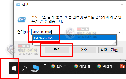 1) 맨 처음처럼, 윈도우 시작버튼 + R 을 누른다 -> services.msc 입력 후 엔터