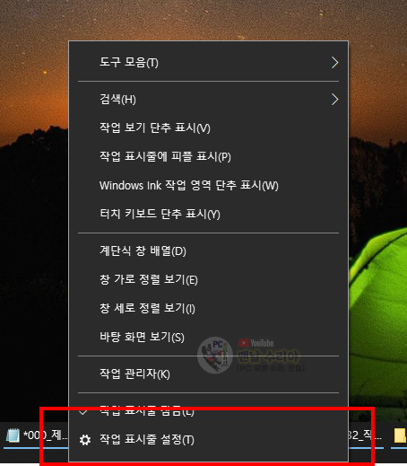1) 작업표시줄 영역에서 마우스 우클릭 (프로그램이 없는 빈 영역에서) -> 작업표시줄 설정