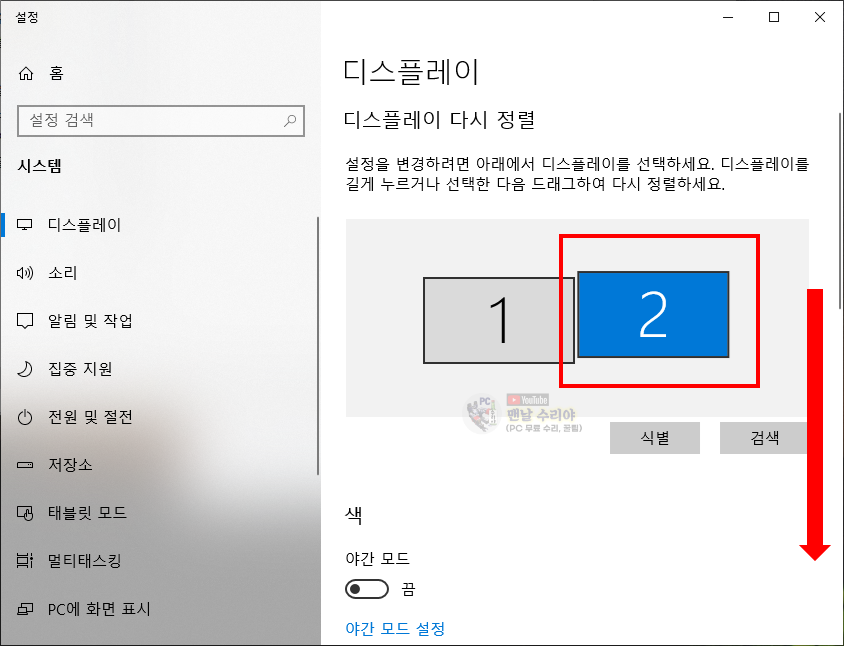 3) 만약 현재 1번이 메인 모니터라면, 2번의 네모 박스를 선택한다음, 스크롤바를 밑으로 쭉 내리자