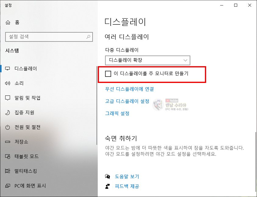 4) [이 디스플레이를 주 모니터로 만들기]를 체크하면 된다.