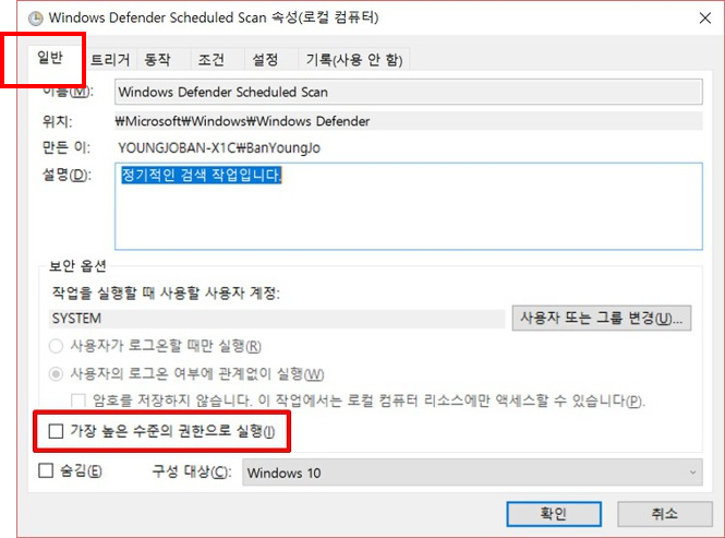 3) 상단 [일반]탭 -> "가장 높은 수준의 권한으로 실행" 체크 해제