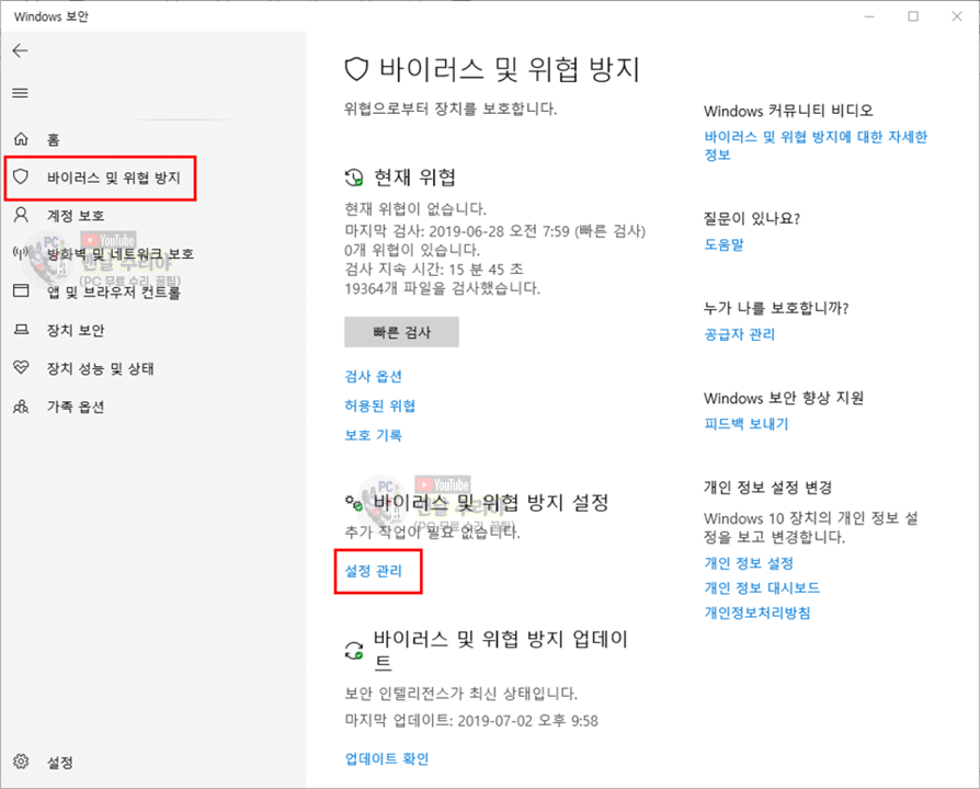 5) 바이러스 및 위협방지 설정 -> [설정 관리] 클릭