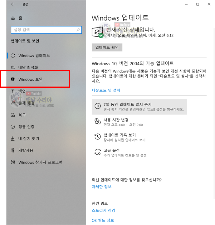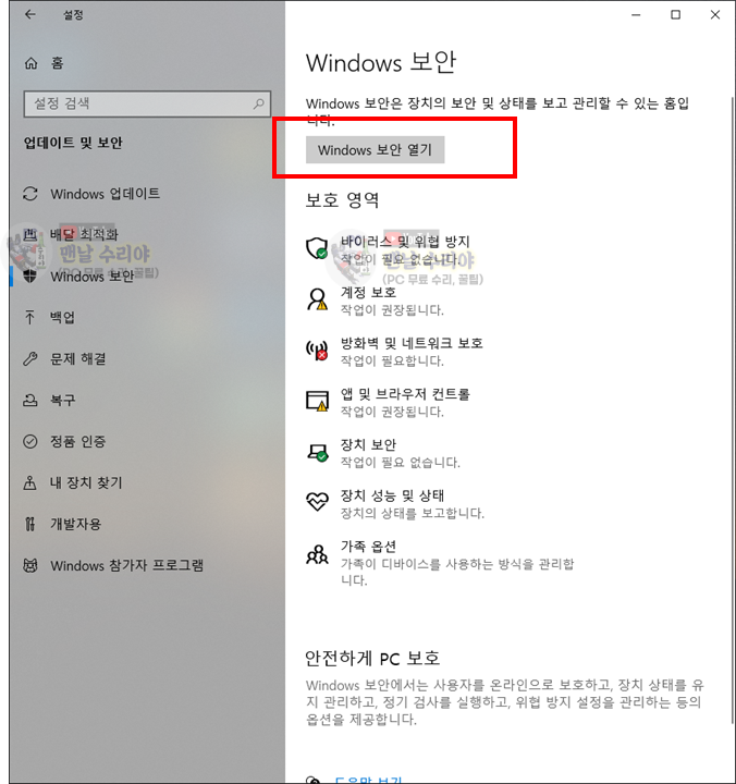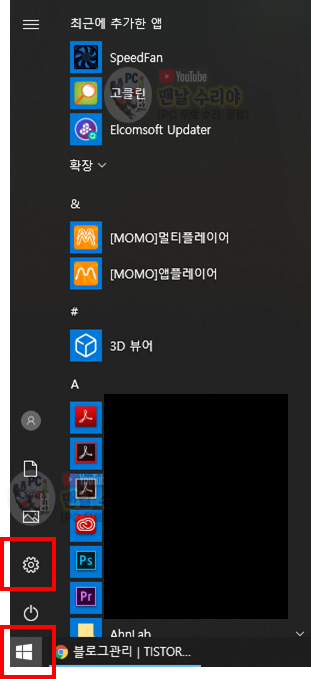 1) 윈도우 시작버튼 -> 톱니바퀴 (아이콘) -> 업데이트 및 보안