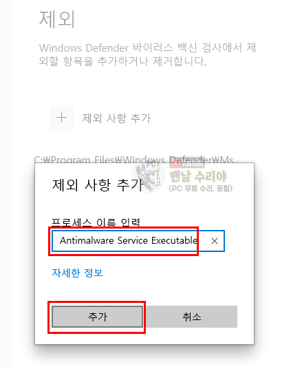 7) 제외 사항 추가 -> [파일] -> 아래 경로의 "MsMpEng.exe" 열기