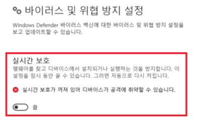 윈도우10 에서는 [실시간 보호 기능] 이라고 하며, 아래 사진으로도 설명드리겠지만