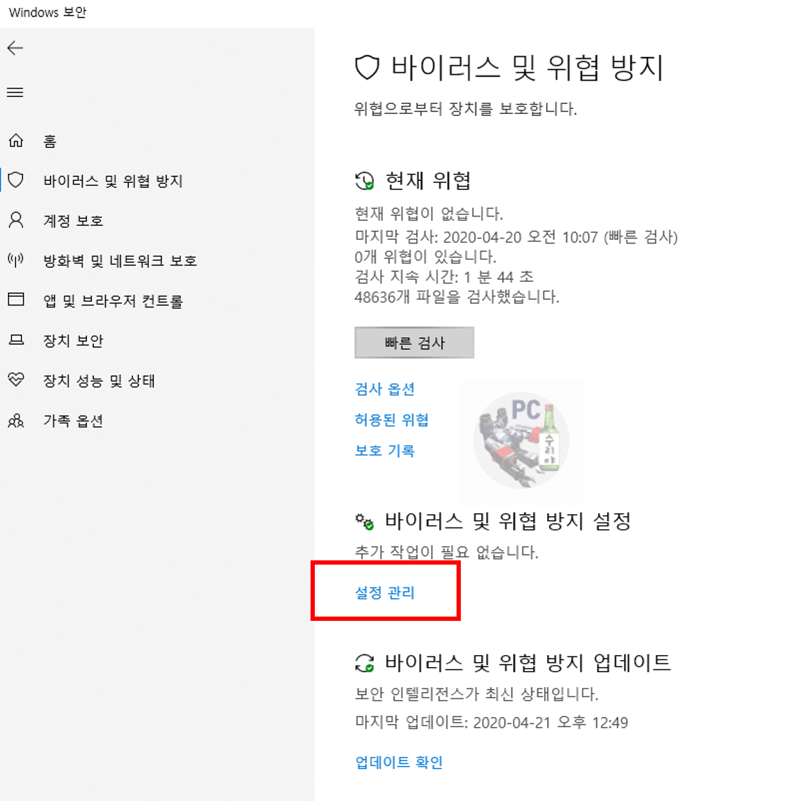 4) 바이러스 및 위협방지 메뉴 클릭
