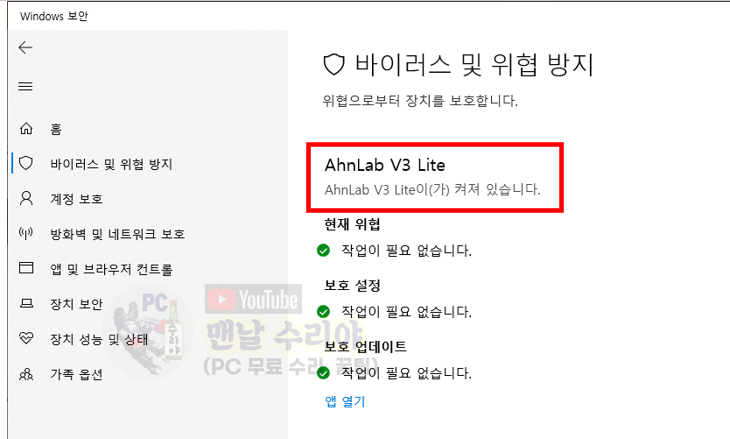 6) 혹시 위의 실시간 보호가 없고, Ahnlab이나 알약등의 다른 백신 프로그램을 사용중이라면