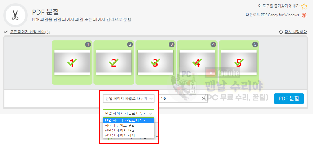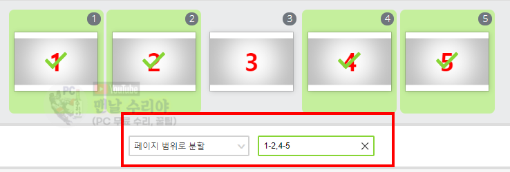 만약 1,2,3,4,5 처럼 쉼표로 구분하면 위의 "단일 페이지 파일로 나누기"와 똑같은 효과이다.