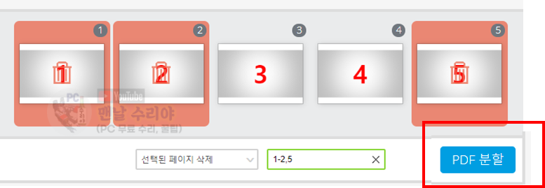 아래처럼 1-2, 4-5를 선택하면, 3페이지가 삭제되어, 1,2,4,5로 구성된 PDF 1장이 나오는 것이다.