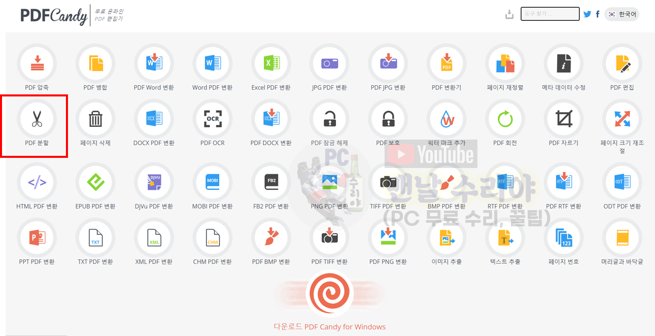 2) 아래의 화면에서 "PDF 분할"을 클릭한다