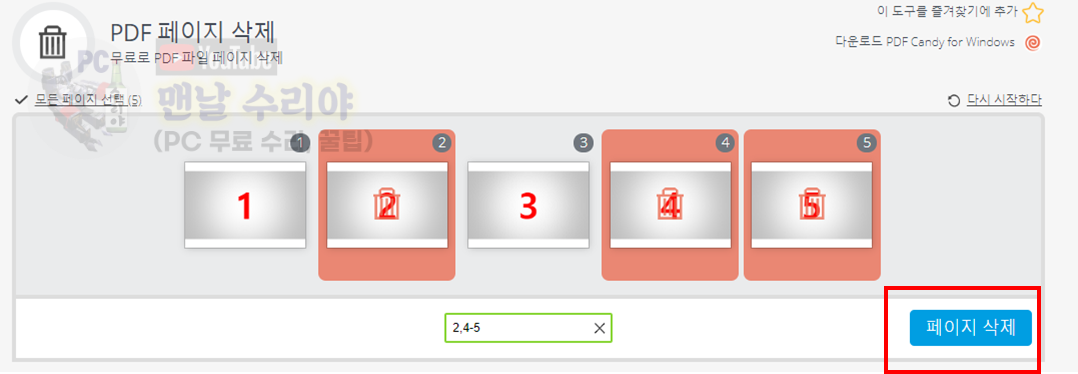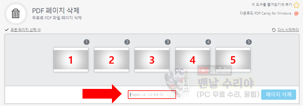 4) 아래의 화면처럼, PDF의 모든 페이지가 나타날 건데, 아래 빨간 네모 박스에 삭제하고 싶은 페이지를 입력한다.