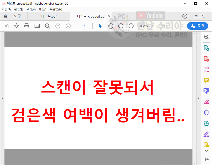 오늘은 PDF 파일의 검은색 여백, 특정 영역 부분을 자르는 방법을 알아본다. 가끔 스캔할 때 영역설정이 잘못돼서 검은색 배경이 생겨버리는 경우가 있다. 또는 원하지 않는 글자나 사진, 문구등을 그 부분만 오려내거나 삭제하고 싶은 경우가 있다. 이럴땐 스캔이나 원본자료를 수정하면 되겠지만, 그 과정이 번거로운 경우가 있다.