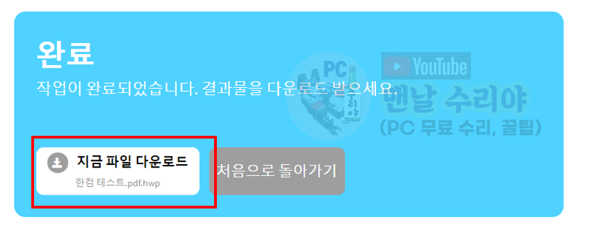 7) PDF 파일이 한컴오피스로 변환 완료 -> 지금 파일 다운로드, 클릭