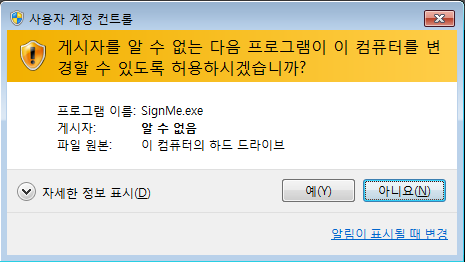 1) 사용자 계정 컨트롤 : 게시자를 알 수 없는 다음 프로그램이 이 컴퓨터를 변경할 수 있도록 허용하시겠습니까?