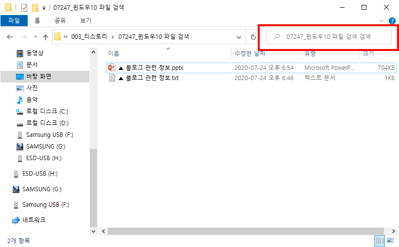 아니면 윈도우 탐색기 (=윈도우창) 우측상단쪽에 검색창을 활용할 수도 있지만