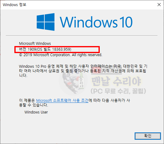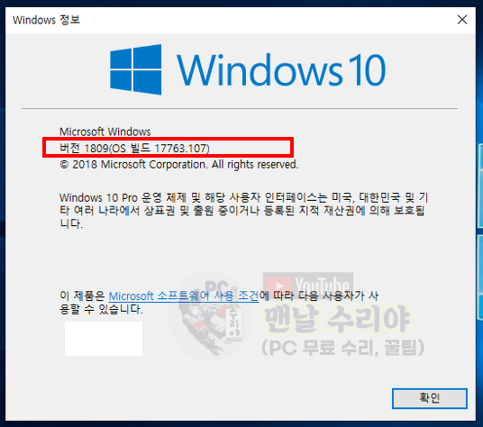 아래 빨간네모에 내 Windows 윈도우 버전이 있다
