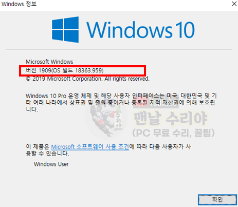 1) 윈도우 시작버튼 + 키보드 R 클릭 -> 실행창 -> winver 입력후 엔터