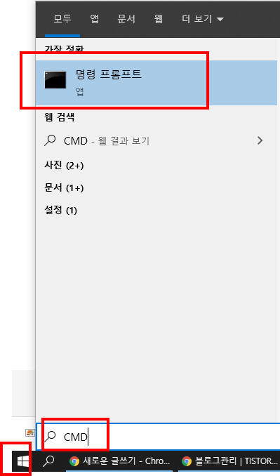1) 윈도우 시작버튼 -> CMD 입력 -> 명령 프롬프트, 클릭