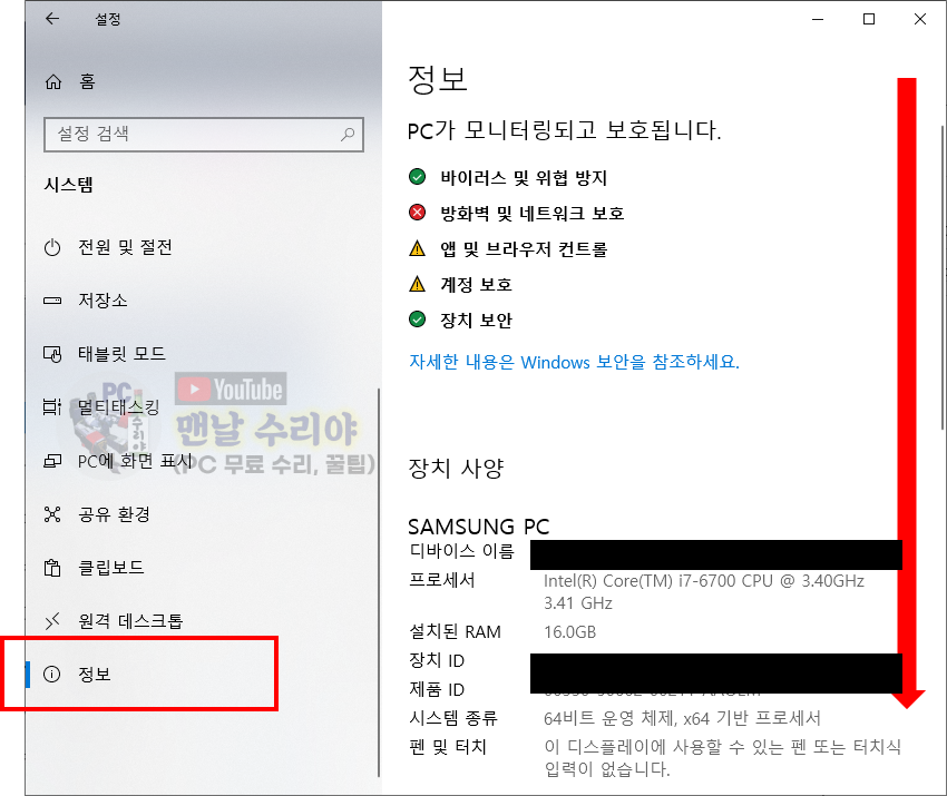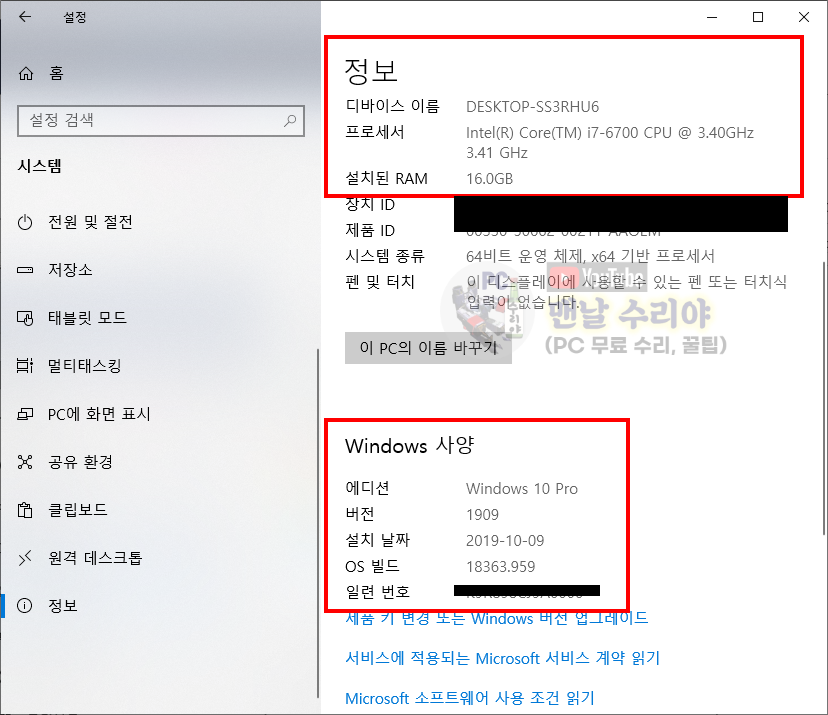 5) 위쪽 빨간네모는 내 PC 사양을 간단히 알 수 있다, (CPU, RAM)