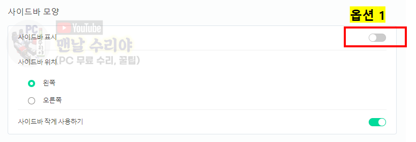 (1) ON/OFF 버튼은, 이 사이드바를 아예 숨기는 방법이다 (나중에 단축키로 다시 ON/OFF 할 수 있다)