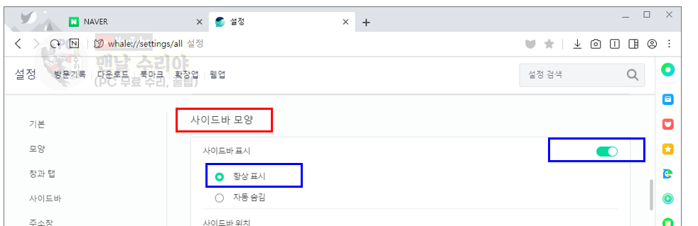 * 웨일 브라우저 사이드바 패널 숨기는 법, 다시 나타나게 하는법