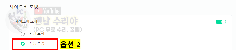 옵션1에서 아예 숨겨놓고, 이 단축키를 눌러도 숨었다가 나타났다 하니까, 이를 추천한다.