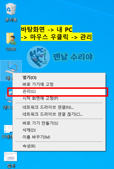 6) 바탕화면 - 내PC - 마우스 우클릭 - 관리로 들어가보자.