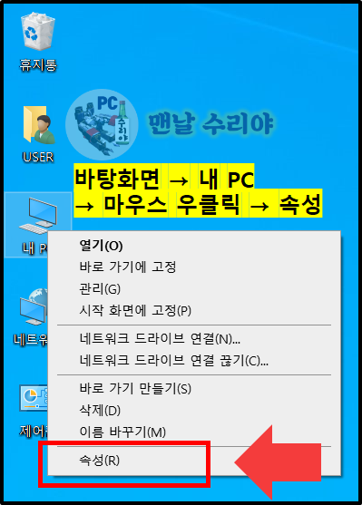 1) 먼저 바탕화면에 있는 내 PC를 클릭 후, 마우스 우클릭 -> 속성을 누릅니다.