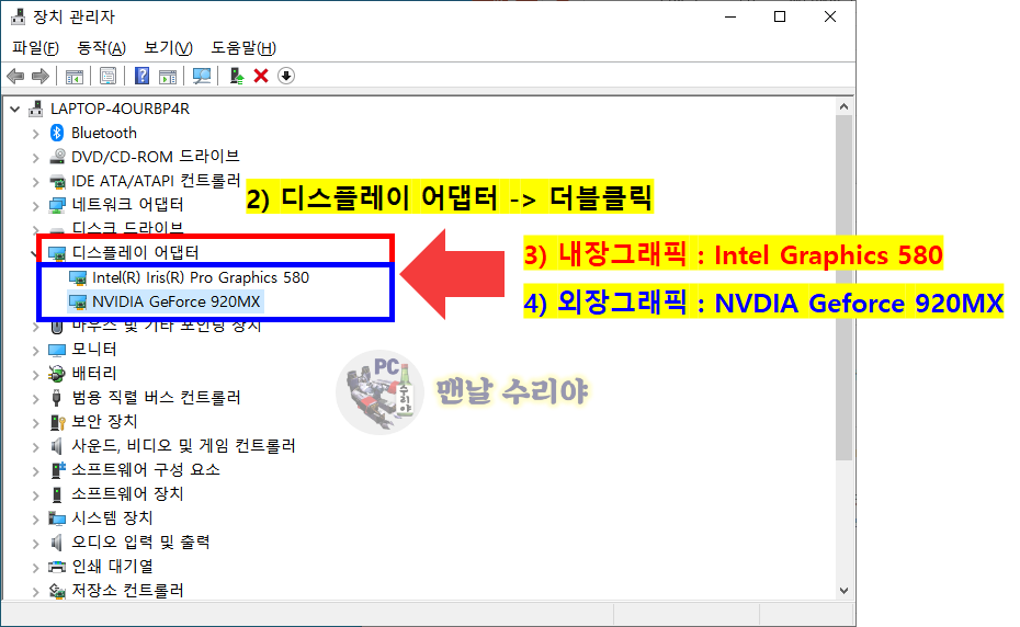 4) 아래 사진과 같이 여러 항목이 나타나는데, [디스플레이 어댑터] 클릭 -> intel ~~ 부분이 내장그래픽, NVDIA 부분이 외장그래픽인데, 이것은 각자의 컴퓨터 사양마다 다르다. 하지만 보통 내장그래픽에 위에 있고, 외장그래픽이 밑에 있다고 보면된다.