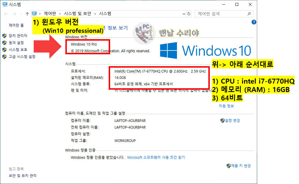 2) 아래 화살표와 같이, windows 10 professional 임을 확인하고, CPU, 메모리, 윈도우 비트수를 10초만에 확인해줍니다.