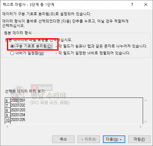 3) 그럼 아래와 같은 화면이 나타나는데, [구분 기호로 분리됨] 선택 후 [다음]을 클릭한다