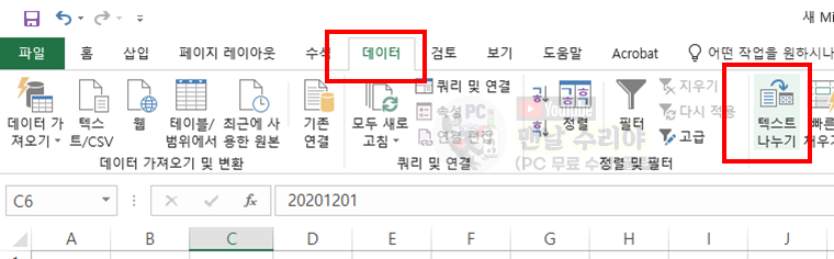 2) 그 다음 엑셀 파일의 상단에 [데이터]를 클릭 후, 아래쪽에 [텍스트 나누기]를 클릭한다