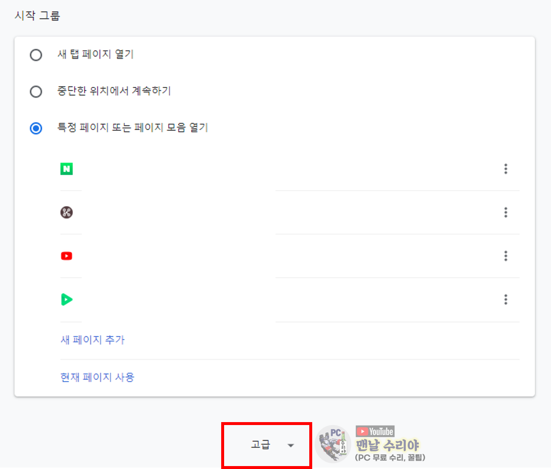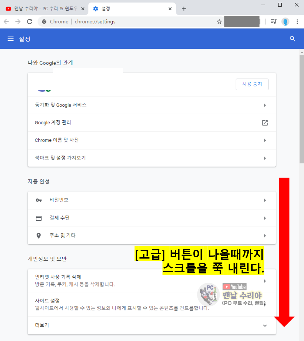 3) 여러가지 메뉴들이 나타날텐데, [고급] 버튼이 나올때까지 스크롤을 쭉 내린다.