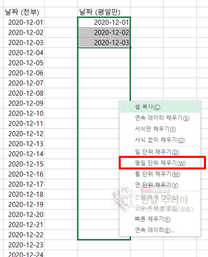 그럼 날짜가 바로 입력되지 않고, 메뉴창이 하나 뜨는데 여기서 [평일 단위 채우기]를 클릭하면