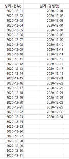 일단 우측의 내용이 더 짧은것을 한눈에 알 수 있다. 주말을 제외한 평일 날짜만 입력됐기 때문이다.
