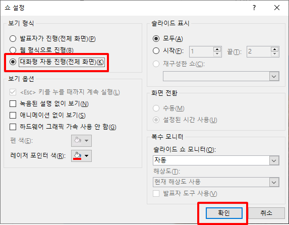 2) 그럼 아래와 같은 [쇼 설정] 창이 나타나는데, [대화형 자동 진행 (전체화면)]을 클릭 후, [확인]