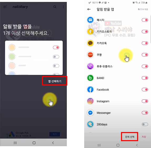 5) 앱 선택하기를 누르고, 모든 설정화면에서 [전체 선택]을 통해 모두 해제 후, 카카오톡만 선택 저장한다
