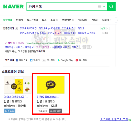 ** 주의 : 가끔 아래와 같이 네이버 소프트웨어에서 제공하는 카카오톡 설치 페이지가 열릴 수 있는데,
