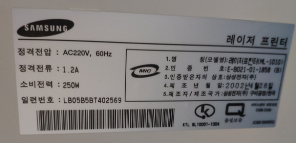 4) 혹시 제품명이나 모델명이 뭔지 모르시는분들을 위해 설명드리면, 보통 프린터 앞쪽이나 뒷쪽 제원에 붙어있다. 아래 사진 참고