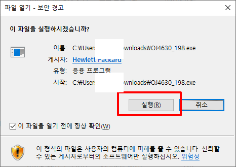 이는 브라우저별로 다운로드 시도시 나타나는 경고창이며, HP라는 신뢰할 수 있는 사이트에서