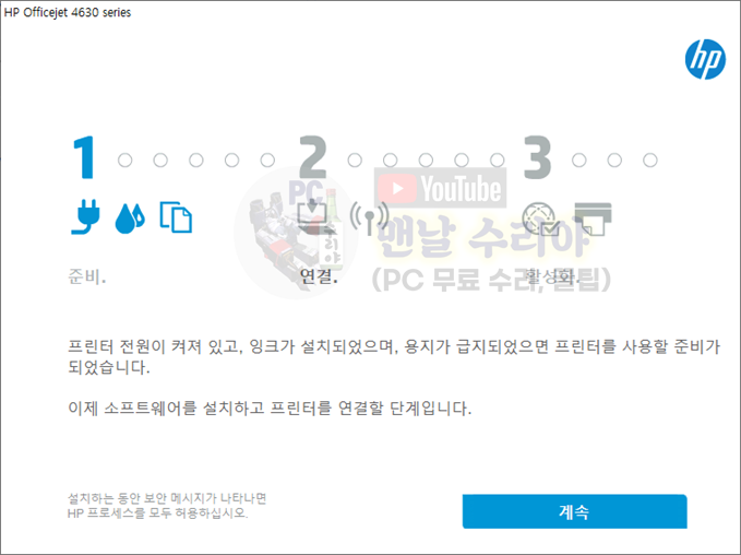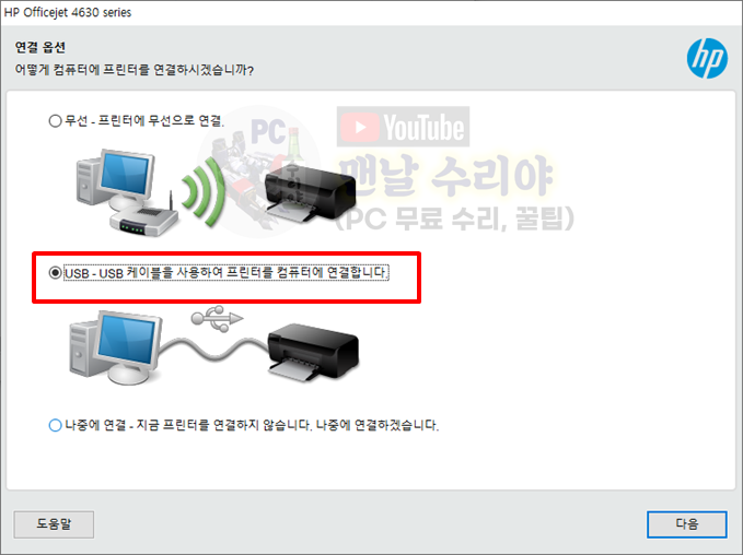 모든 설치가 완료 후, PC를 재부팅 한 후, 프린터의 USB 케이블과 PC를 연결하시면