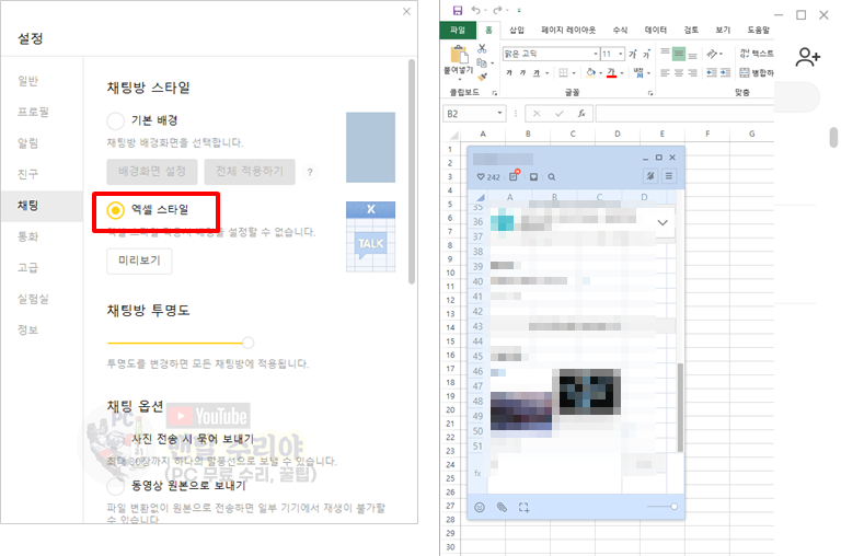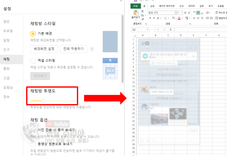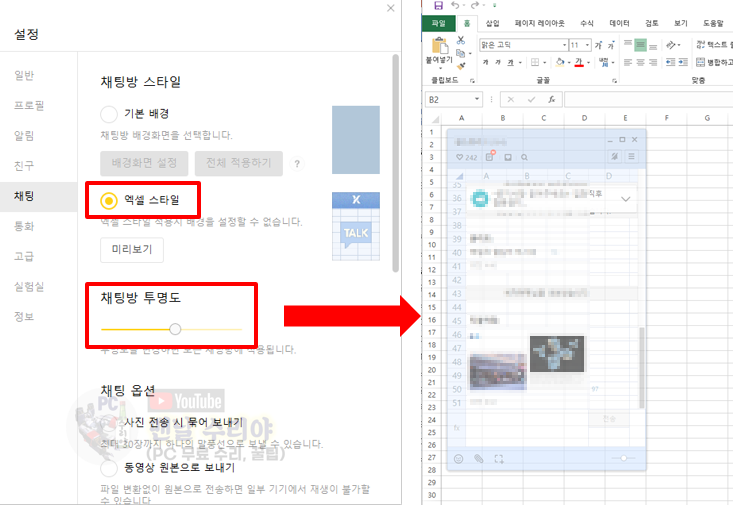 5) 여기서 [채팅방 투명도]의 버튼을 중간정도로 이동시키면, 카톡 채팅창이 투명해지면서 엑셀과 좀 더 섞인다.