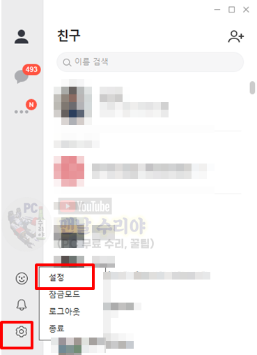 PC 카톡을 실행 후, 좌측 하단에서 톱니바퀴 아이콘을 클릭 > 설정 클릭